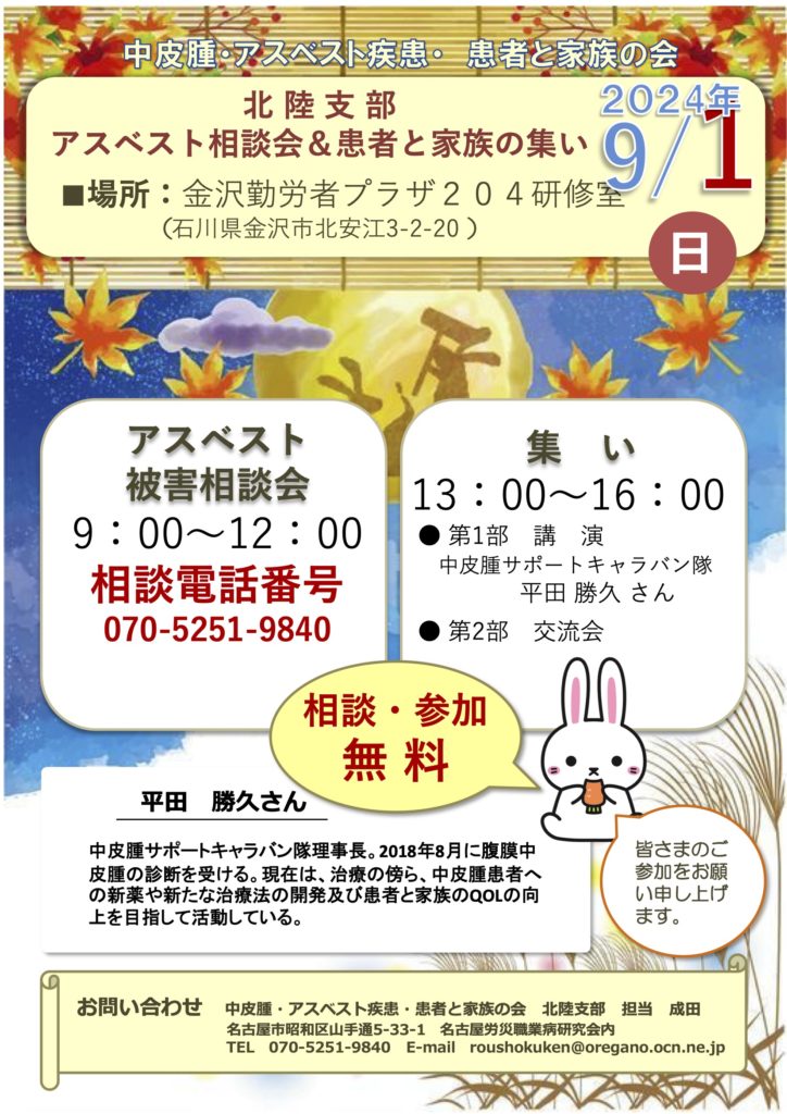 2024/08/20 お知らせ 北陸支部 <9・1>北陸支部 金沢相談会と集いのご案内 北陸支部では以下のとおり、相談会と集いを開催します。 日時:9月1日(日)9時〜12時 相談会 13時〜16時 集い 場所:金沢勤労者プラザ204研修室 お知らせ一覧
