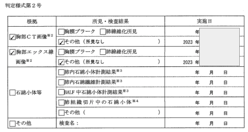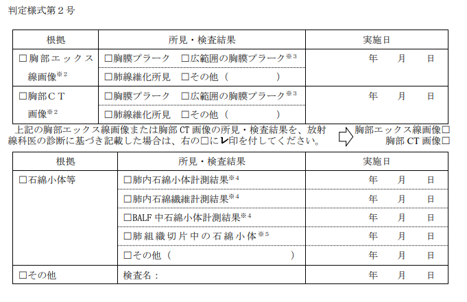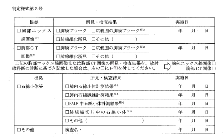 というのも、審査は申請者が提出するレントゲンやCTの画像データなどに基づいて、石綿健康被害判定小委員会の委員が行うため、主治医の診断意見に関係なく審査がされます。したがって、記載がなくても判定されるのです。なお、主治医が根拠欄に何らかの所見があることを記入しても、それが判定小委員会の委員によって否定されることも珍しくありません。