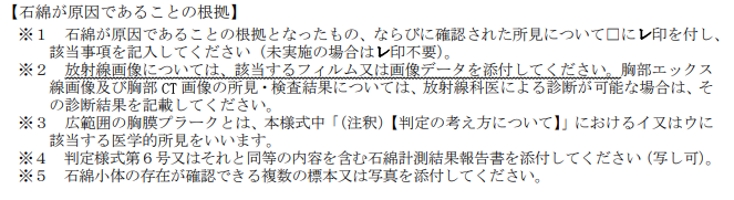 再び、話を救済制度に戻したいと思います。先に触れた「石綿が原因であることの根拠」の記入欄ですが、実は空欄でも審査はされます。というよりも、この記入欄の記載内容は全く審査に影響しません。