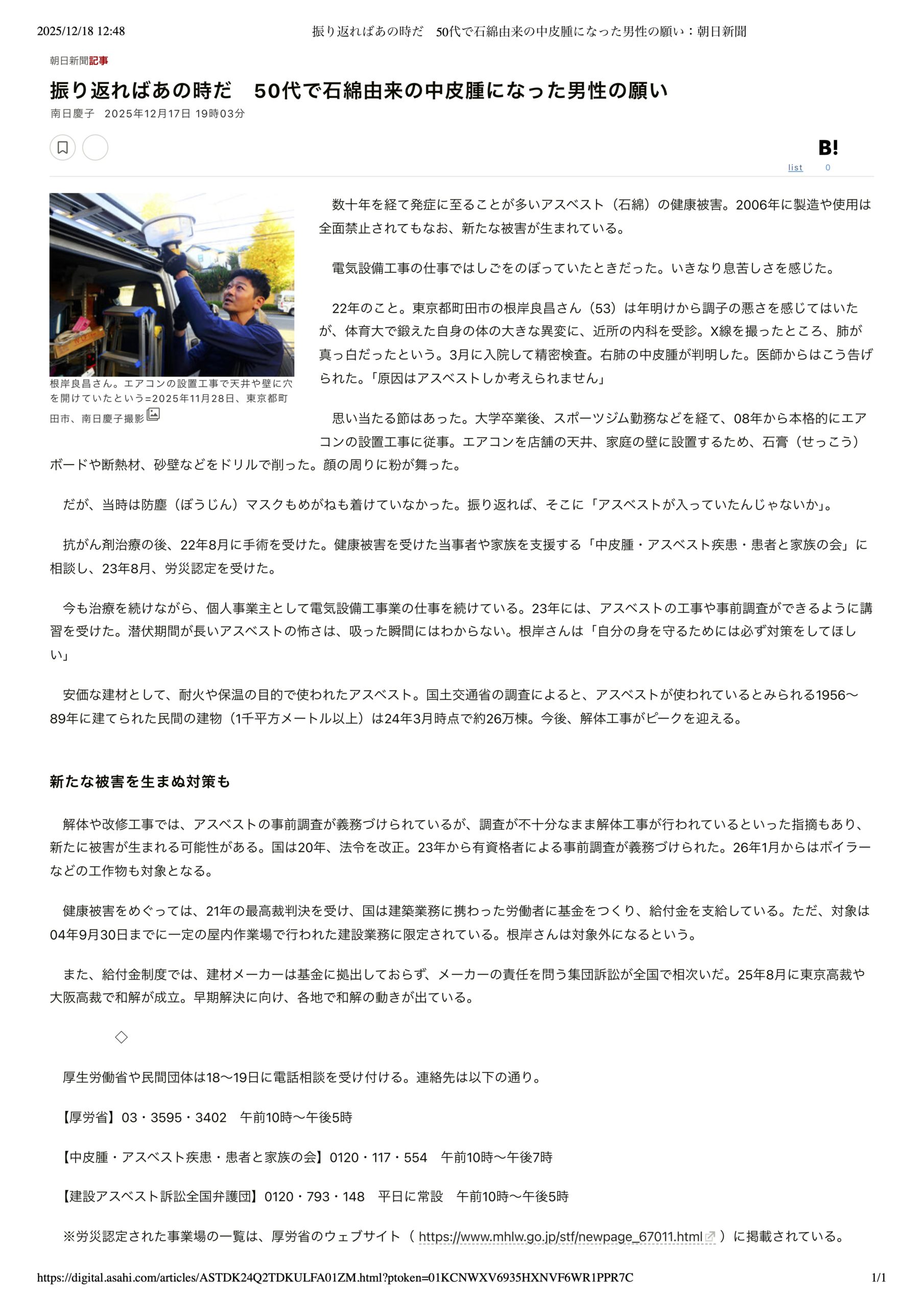 振り返ればあの時だ 50代で石綿由来の中皮腫になった男性の願い(2025年12月17日)