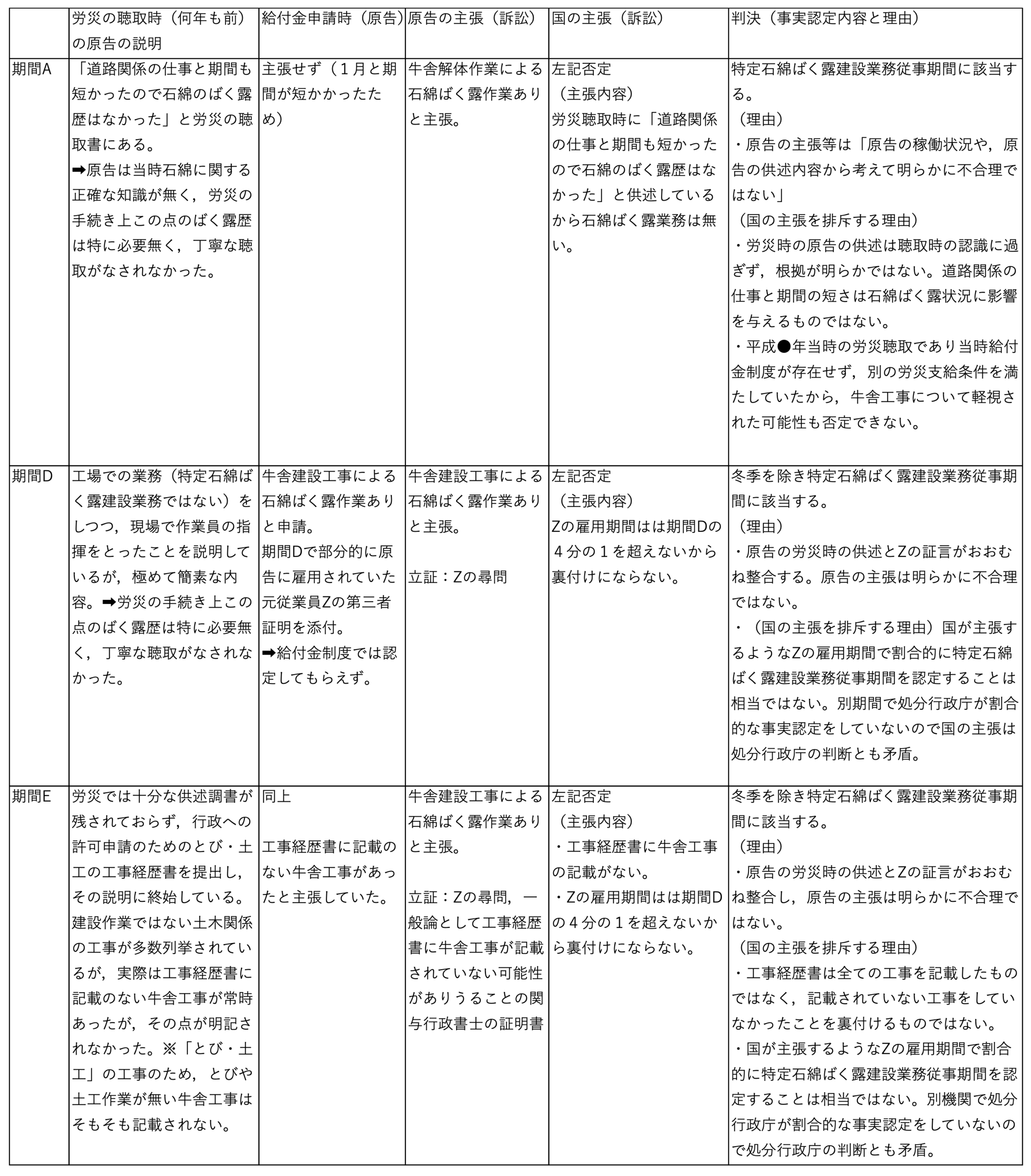 以下,原告の労災聴取時の説明,給付金申請時の主張と証明資料,訴訟での当事者の主張等を表にしてみました。要約しているため,不正確な内容になっている可能性があることはご容赦いただきたく思います。