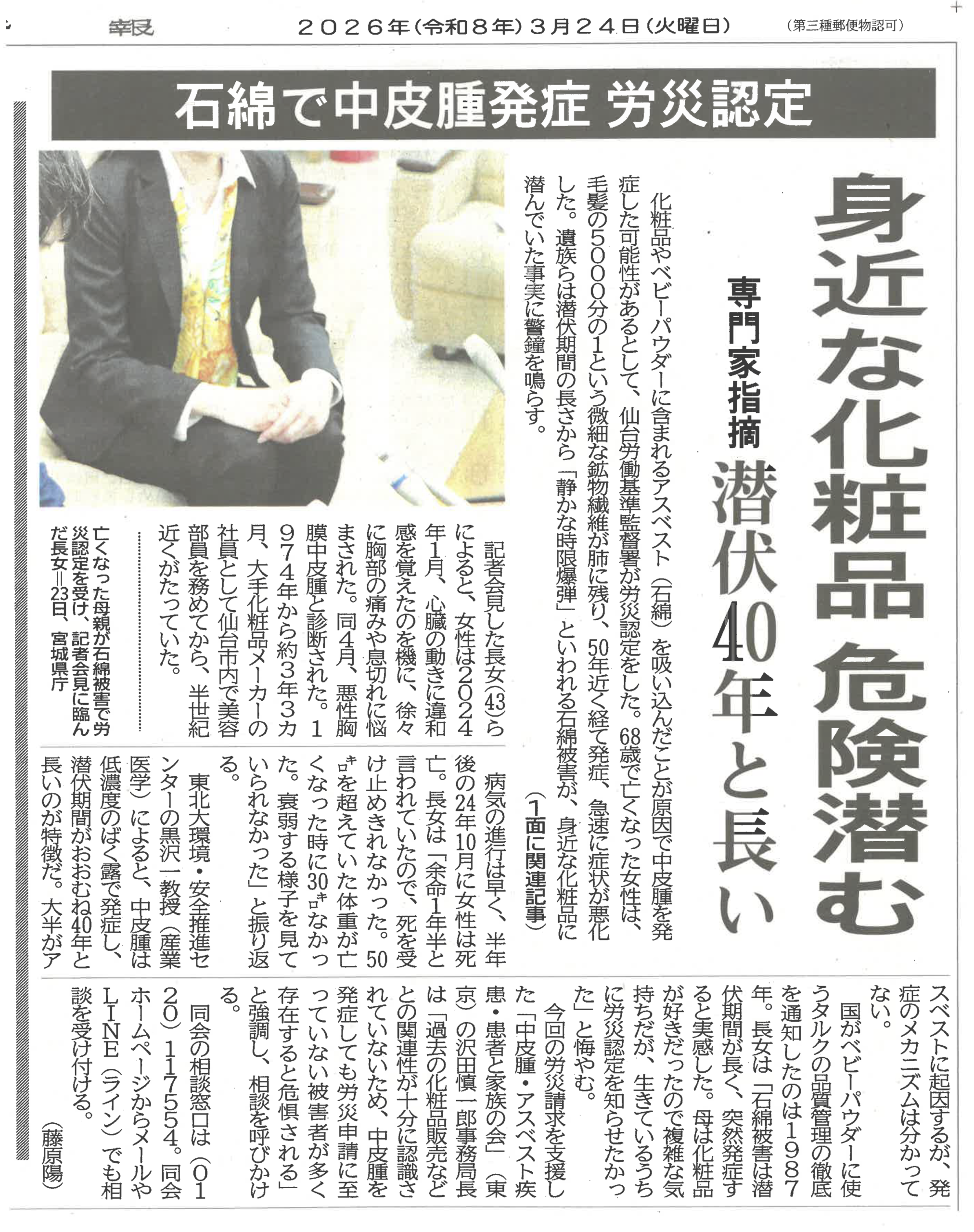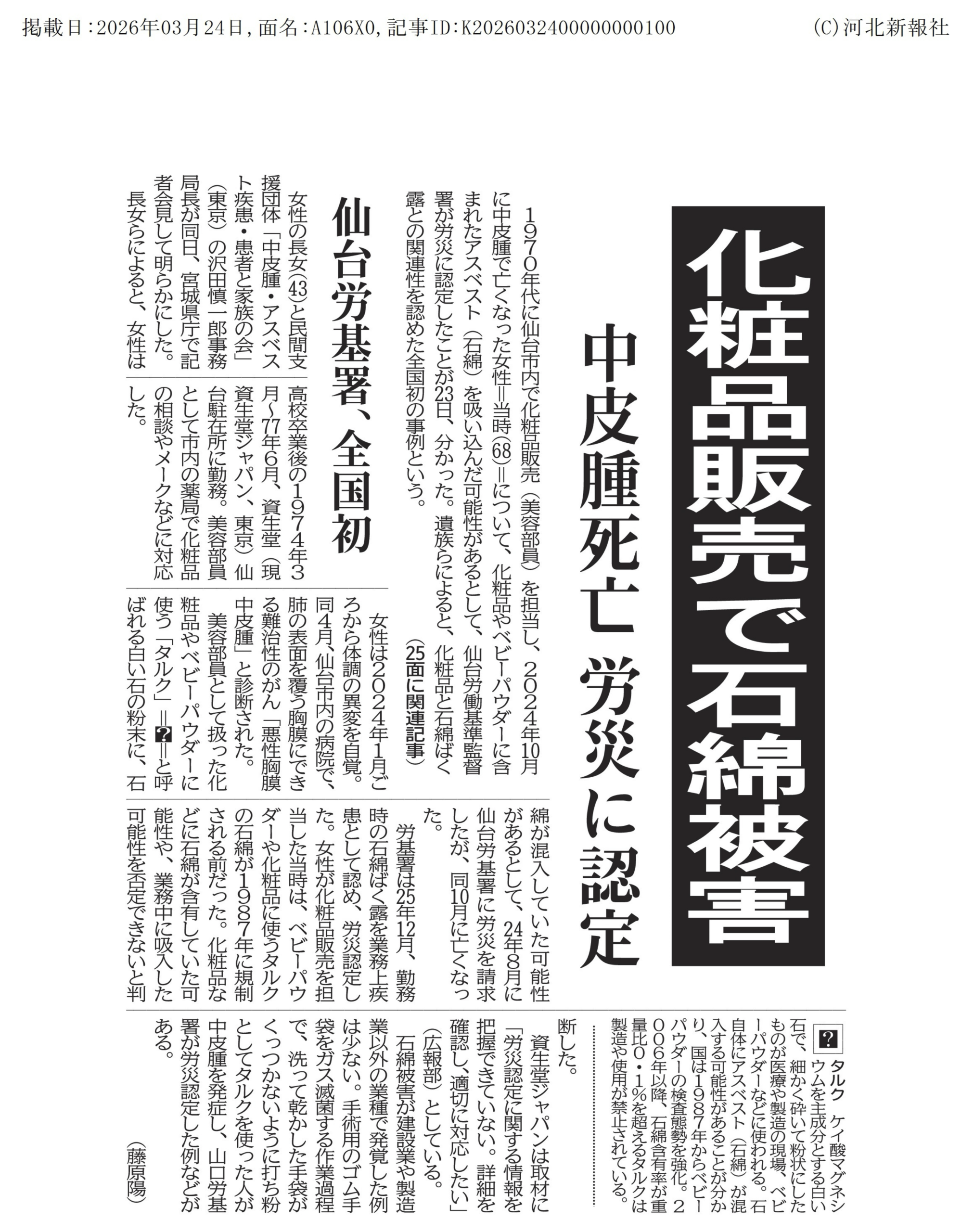 化粧品販売で石綿被害 中皮腫死亡 労災に認定 仙台労基署 全国初(2026年3月24日、河北新報社)