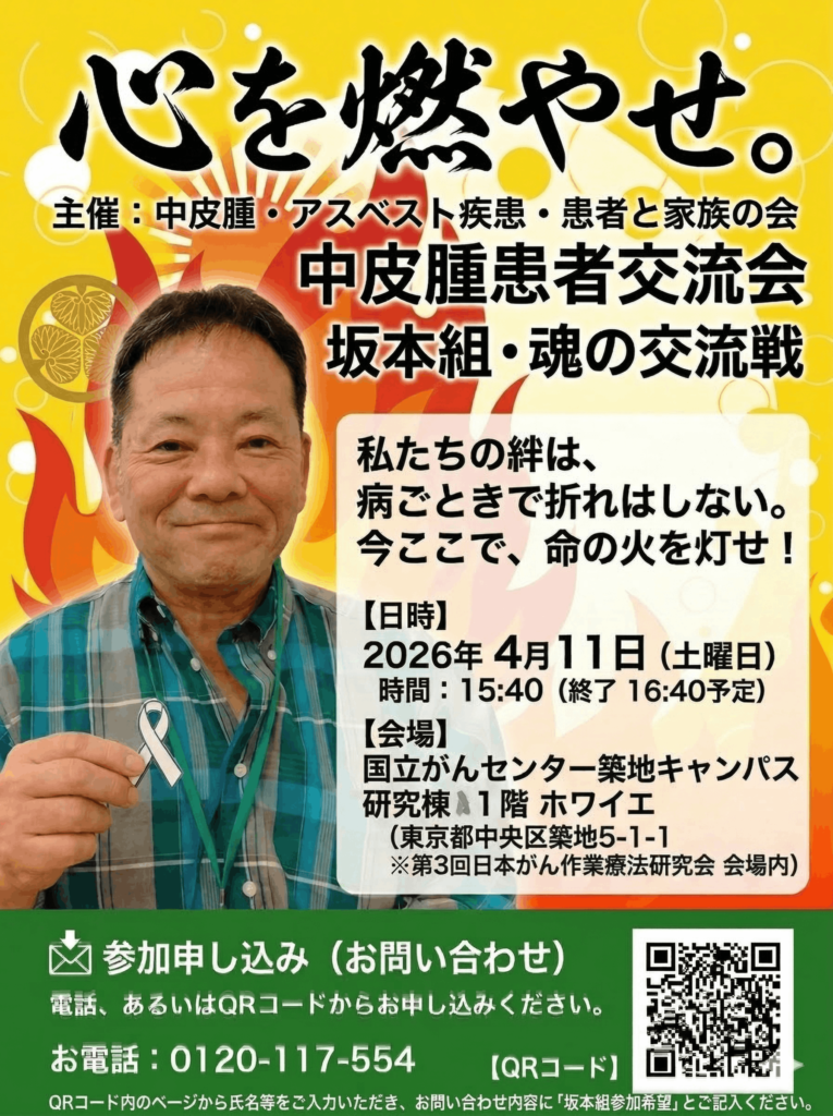 2026/04/03 お知らせ 胸膜中皮腫 腹膜中皮腫 <4・11>築地 中皮腫患者交流会(坂本組)開催のご案内 4月11日(土)に下記のとおり中皮腫患者交流会を開催します。みなさまのご参加をお待ちしております。 日時:2025年4月11日(土)15時40分〜16時30分 場所:国立がん研究センター築地キャンパス 研究棟1階ホワイエ(築地5-1-1) ※第3回日本がん作業療法研究会 会場内 申込:こちらのページにて、氏名等を入力頂き、お問い合わせ内容に「坂本組参加希望」とご記入ください。 お知らせ一覧
