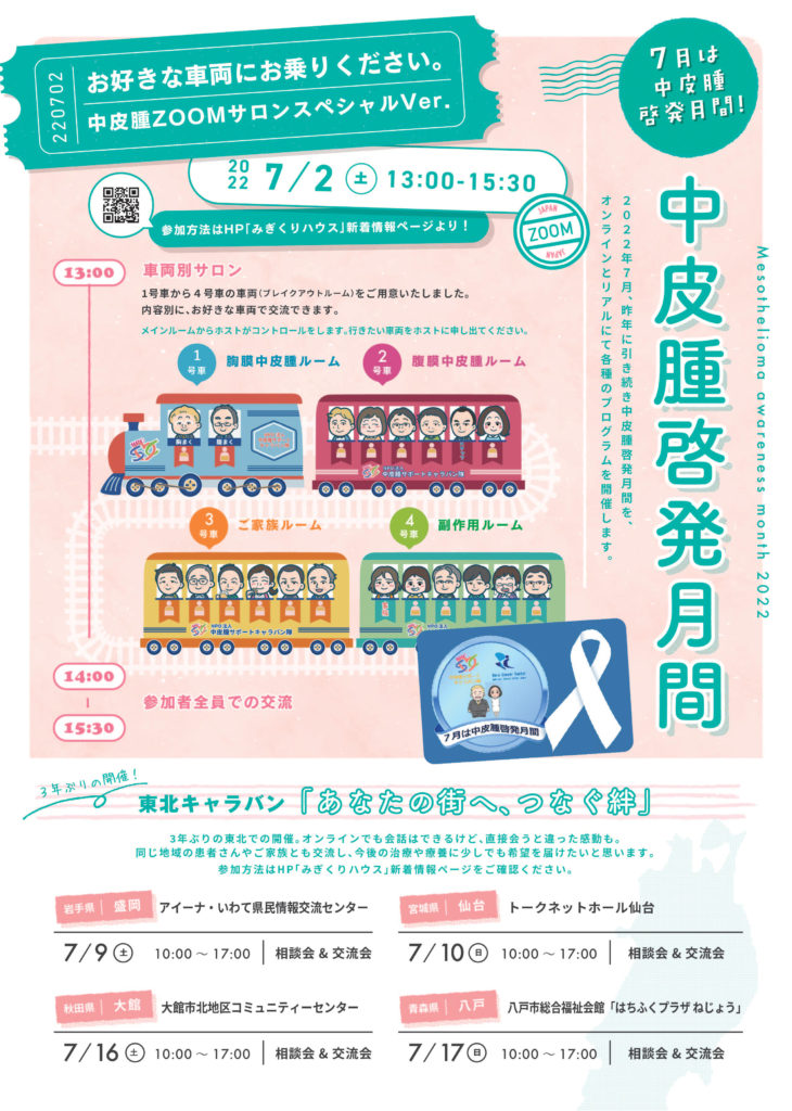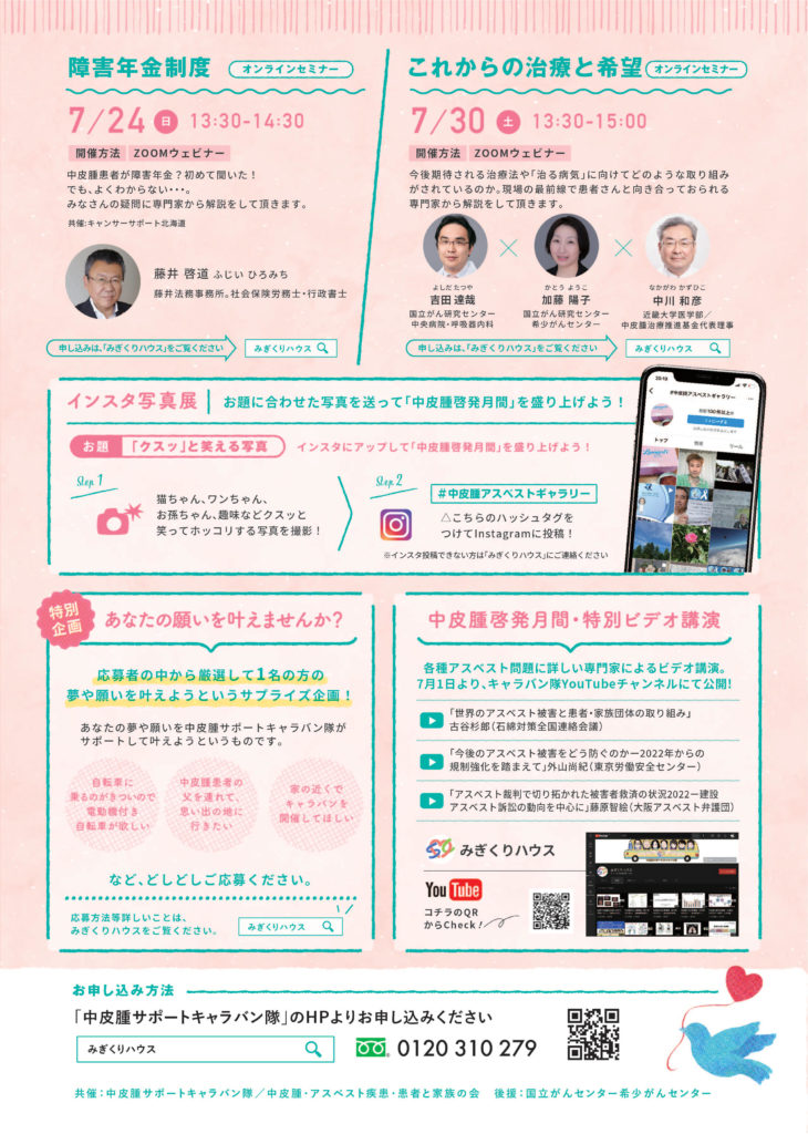 昨年より、特定非営利活動法人中皮腫サポートキャラバン隊や国立がん研究センター希少がんセンターと協力して7月に実施してきました「中皮腫啓発月間」の取り組みを今年もおこないます。専門家による講演会などを予定しておりますので、ぜひご参加ください。